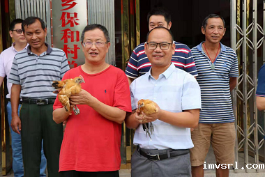 印遇龙院士(左一)和帮扶工作队队长罗小军(右一)抱着保和鸡
