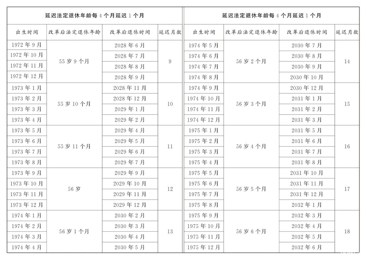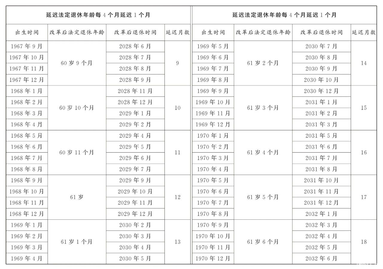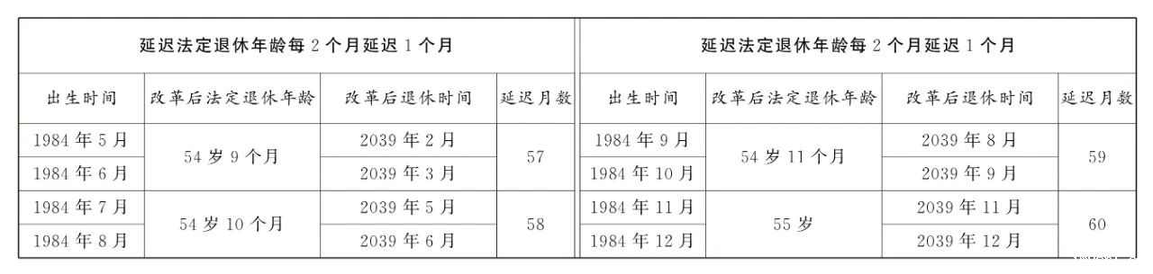 第一条 从2025年1月1日起,男职工和原法定退休年龄为五十五周岁的女职工,法定退休年龄每四个月延迟一个月,分别逐步延迟至六十三周岁和五十八周岁;原法定退休年龄为五十周岁的女职工,法定退休年龄每二个月延迟一个月,逐步延迟至五十五周岁。国家另有规定的,从其规定。