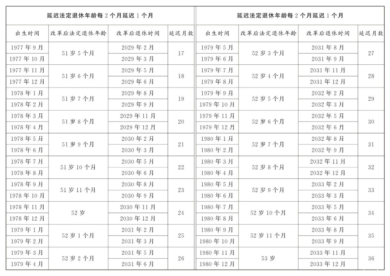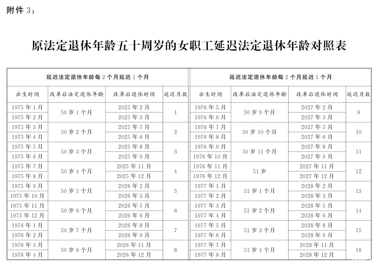 3.原法定退休年龄五十周岁的女职工延迟法定退休年龄对照表
