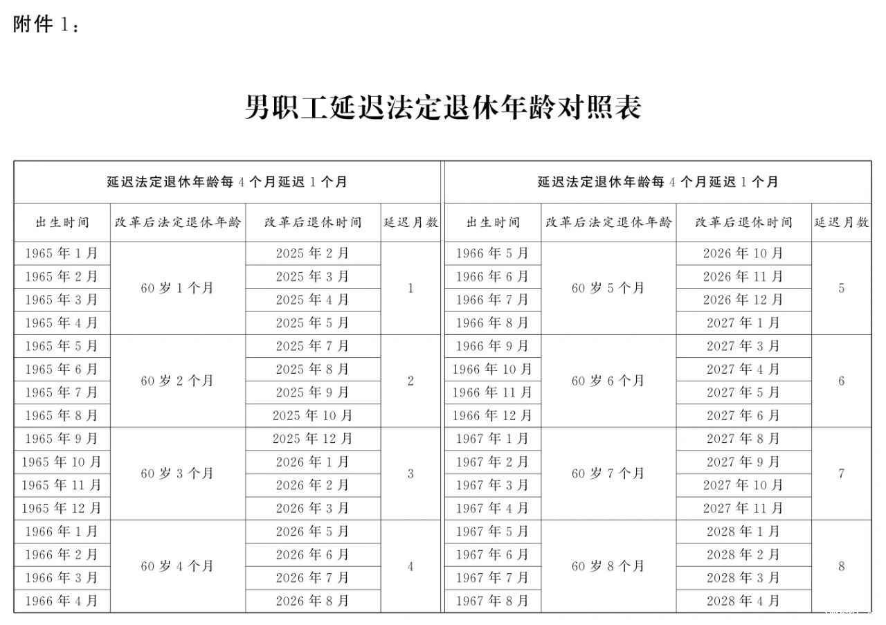 1.男职工延迟法定退休年龄对照表