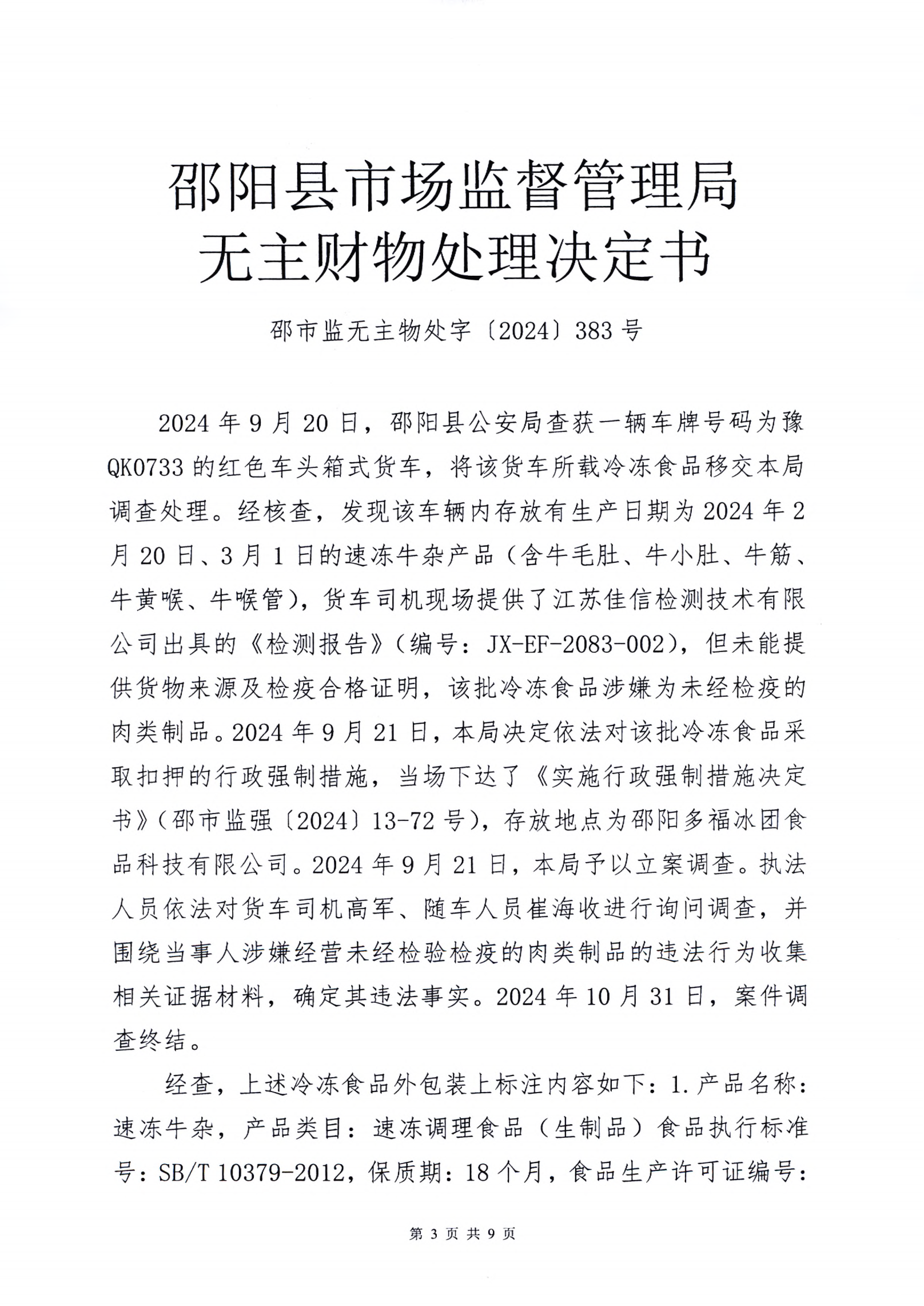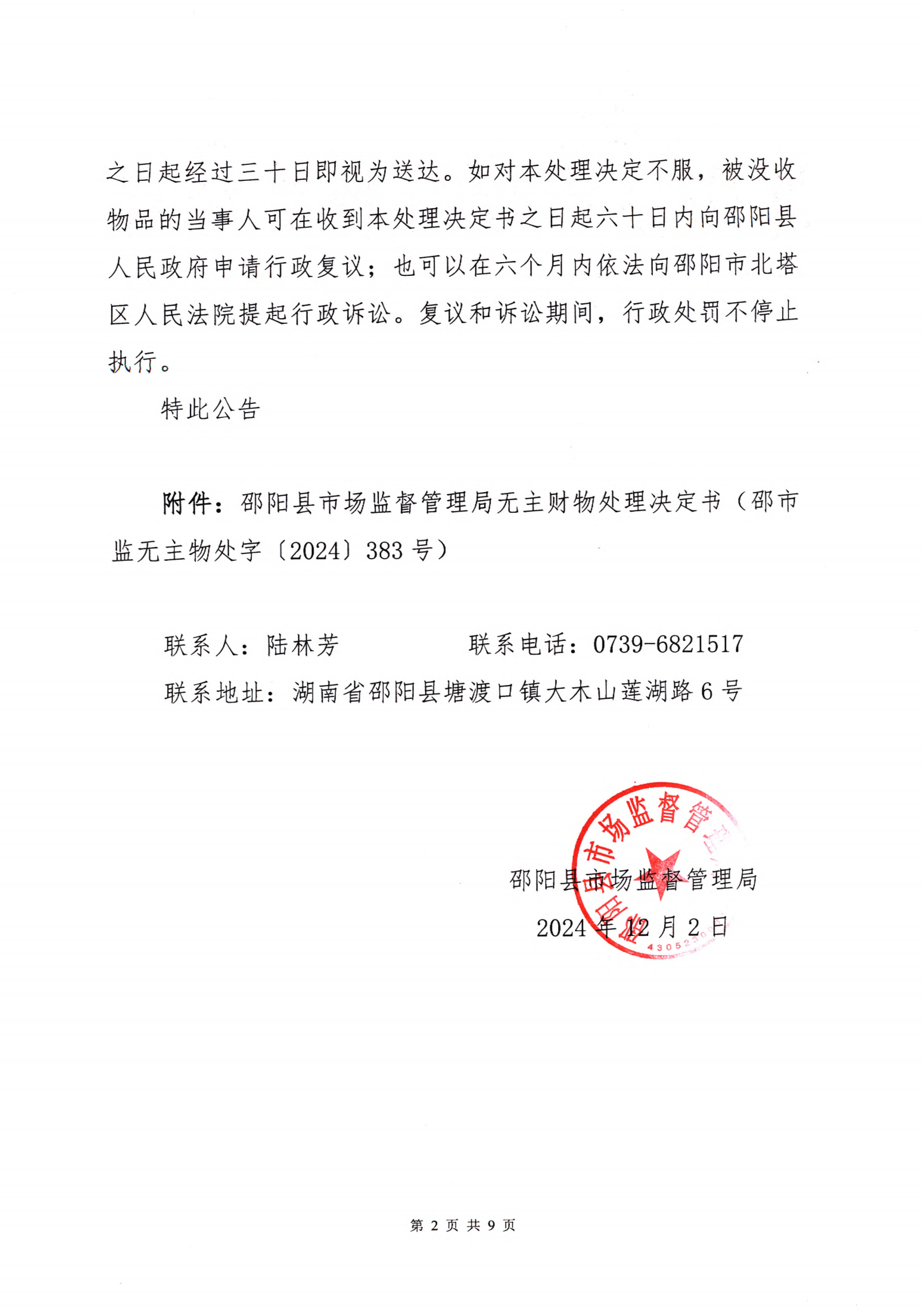 无主财物处理决定书送达公告(邵市监无主物处字〔2024〕383号)