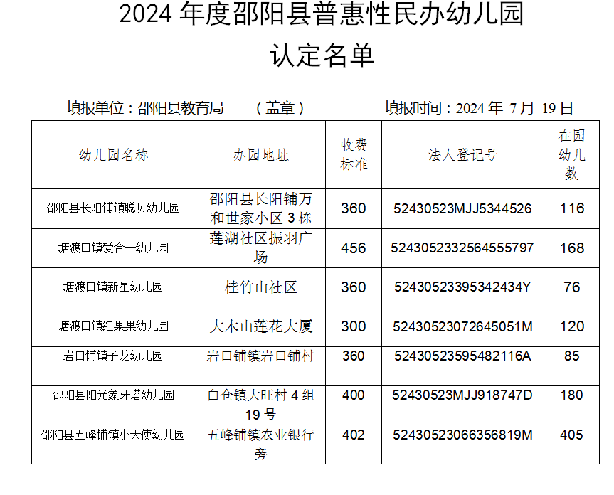 根据湖南省教育厅《关于做好2024年普惠性民办幼儿园认定工作的通知》、《湖南省普惠性民办幼儿园认定及管理暂行办法》(湘教发〔2019〕49号)、市教育局的相关要求及《kaiyun体育娱乐2024年普惠性民办幼儿园认定工作方案》(邵教发[2024]40号)等文件精神,经评审工作组实地考核,局党组研究同意,kaiyun体育娱乐长阳铺镇聪贝幼儿园等7所民办幼儿园达到普惠性民办幼儿园标准,拟认定为2024年度普惠性民办幼儿园,现予以公示,接受社会监督。如有异议,请在公示期内向县教育局基础教育股和机关纪委反映。 电话:0739-6309889,0739-6833712. 公示时间:2024年7月22日-7月26日。 kaiyun体育娱乐教育局 2022年7月22日