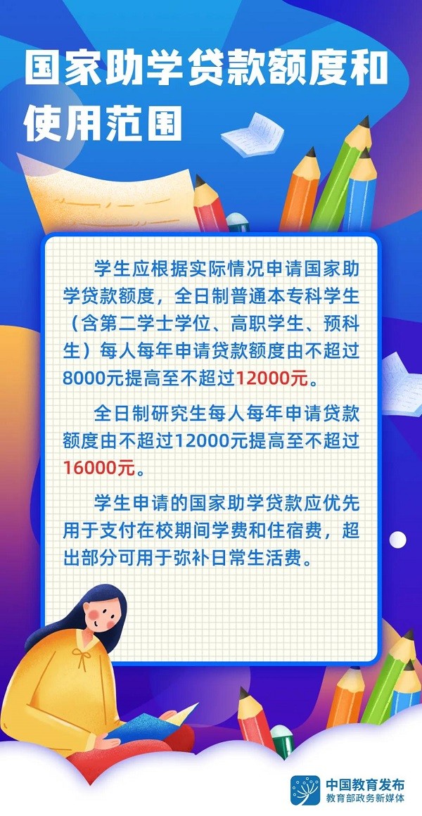 近日,财政部、教育部、人民银行、银保监会印发《关于进一步完善国家助学贷款政策的通知》,提出全日制普通本专科学生(含第二学士学位、高职学生、预科生)每人每年申请贷款额度提高至不超过12000元,全日制研究生每人每年申请贷款额度提高至不超过16000元,自2021年秋季学期起施行。 关于进一步完善 国家助学贷款政策的通知 各省、自治区、直辖市、计划单列市财政厅(局)、教育厅(教委),新疆生产建设兵团财政局、教育局,中国人民银行上海总部、各分行、营业管理部、各省会(首府)城市中心支行,各银保监局,中央部门所属各高等学校,各银行业金融机构: 近年来,国家助学贷款工作取得了显著成效,对资助高校家庭经济困难学生顺利完成学业发挥了重要作用。为进一步提升国家助学贷款政策实施效果,经国务院同意,现就完善国家助学贷款政策有关事项通知如下: 一、国家助学贷款额度和使用范围 学生应根据实际情况申请国家助学贷款额度,全日制普通本专科学生(含第二学士学位、高职学生、预科生,下同)每人每年申请贷款额度由不超过8000元提高至不超过12000元;全日制研究生每人每年申请贷款额度由不超过12000元提高至不超过16000元。学生申请的国家助学贷款应优先用于支付在校期间学费和住宿费,超出部分可用于弥补日常生活费。国家助学贷款承办银行要加强贷款及其使用范围审查,合理确定学生助学贷款金额。各高校要引导学生勤俭节约,努力向学、学以致用,增强就业和报效国家、服务社会能力。 二、生源地信用助学贷款风险补偿金 生源地信用助学贷款工作继续以国家开发银行为主承办,鼓励其他银行业金融机构开展生源地信用助学贷款业务。 (一)风险补偿金比例。 风险补偿金比例按当年贷款发生额的5%确定。风险补偿金比例根据经济社会发展状况适时进行调整。风险补偿金由中央和地方分担,具体分担比例按照教育领域中央与地方财政事权和支出责任划分改革方案执行。 (二)风险补偿金管理。 国家开发银行收到风险补偿金,应确认为递延收益,待核销生源地信用助学贷款损失时,计入当期损益;已核销的生源地信用助学贷款损失,以后又收回的,相应回拨递延收益。风险补偿金若低于生源地信用助学贷款损失,不足部分由国家开发银行承担;若超出生源地信用助学贷款损失,超出部分由国家开发银行按规定进行结余奖励返还。有关会计处理按照国家统一的会计制度执行。 国家开发银行应根据国家有关规定制定核销贷款损失的办法,报财政部、教育部、人民银行、银保监会备案。 风险补偿金管理办法由财政部、教育部根据此通知进行修订。 (三)风险补偿金存量资金。 风险补偿金存量资金按照分省(自治区、直辖市、计划单列市,下同)核算的原则,统筹用于支付以后年度中央财政和地方财政应承担的生源地信用助学贷款贴息,直至风险补偿金存量资金规模降至当年贷款余额的5%。 省级财政、教育部门每年1月31日前,将上一年度风险补偿金存量资金使用情况和本年度风险补偿金存量资金用于贴息的预算安排情况,报财政部、教育部备案,并抄送全国学生资助管理中心。 国家开发银行以外的其他银行业金融机构办理的生源地信用助学贷款实行递延收益方式管理且有风险补偿金存量资金的,参照上述办法管理和使用风险补偿金存量资金。 (四)其他事项。 其他银行业金融机构开展生源地信用助学贷款业务的,风险补偿金管理由各省财政、教育、人民银行、银保监部门与该金融机构根据实际情况确定,生源地信用助学贷款损失超出风险补偿金部分由该金融机构承担。各省生源地信用助学贷款风险补偿金,中央财政按照不高于当年贷款发生额的5%和规定的分担比例承担,超过5%的部分全部由地方财政自行承担。已经与其他银行业金融机构开展生源地信用助学贷款业务的省份,应加强与相关金融机构沟通协商,确保生源地信用助学贷款工作平稳有序开展。 此前规定与本通知不一致的,以本通知为准。本通知未规定事项,按照原政策执行。 本通知自2021年秋季学期起施行。 财政部 教育部 人民银行 银保监会 2021年9月3日 扫一扫在手机打开当前页